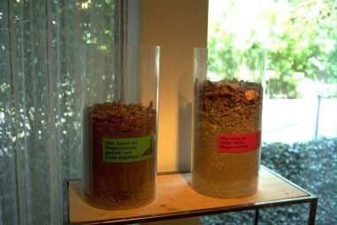 Dans le cylindre de gauche se trouve un échantillon de sol forestier dans lequel de nombreux vers de terre et une intense activité biologique ont déjà recyclé les feuilles mortes. En comparaison, le sol forestier du cylindre de droite n’est pas très actif biologiquement. Il est donc recouvert d’une épaisse couche de feuilles mortes.